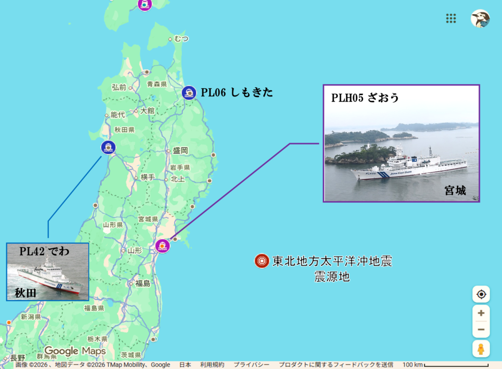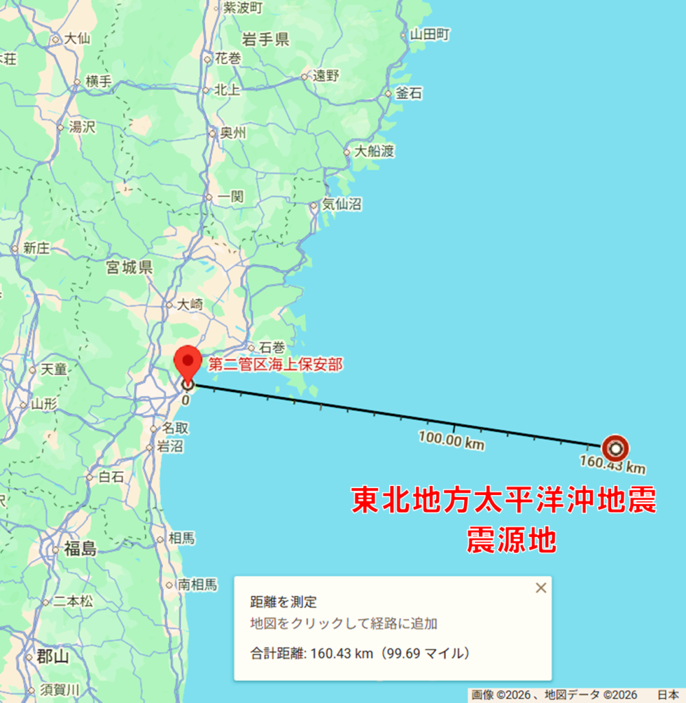 管区本部が所在する塩釜港湾合同庁舎から震源地までの直線距離は約160kmでした。