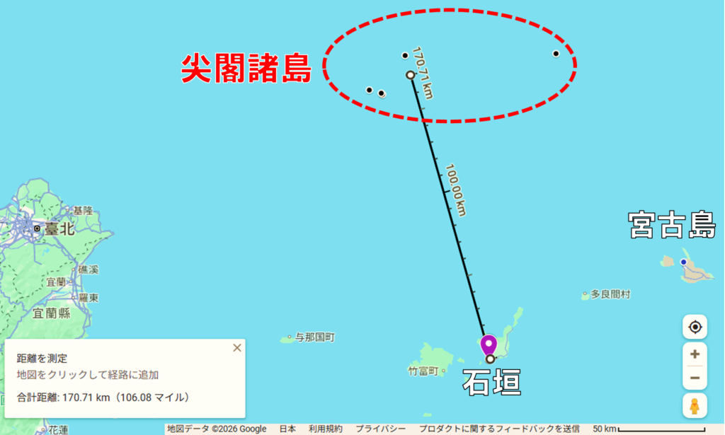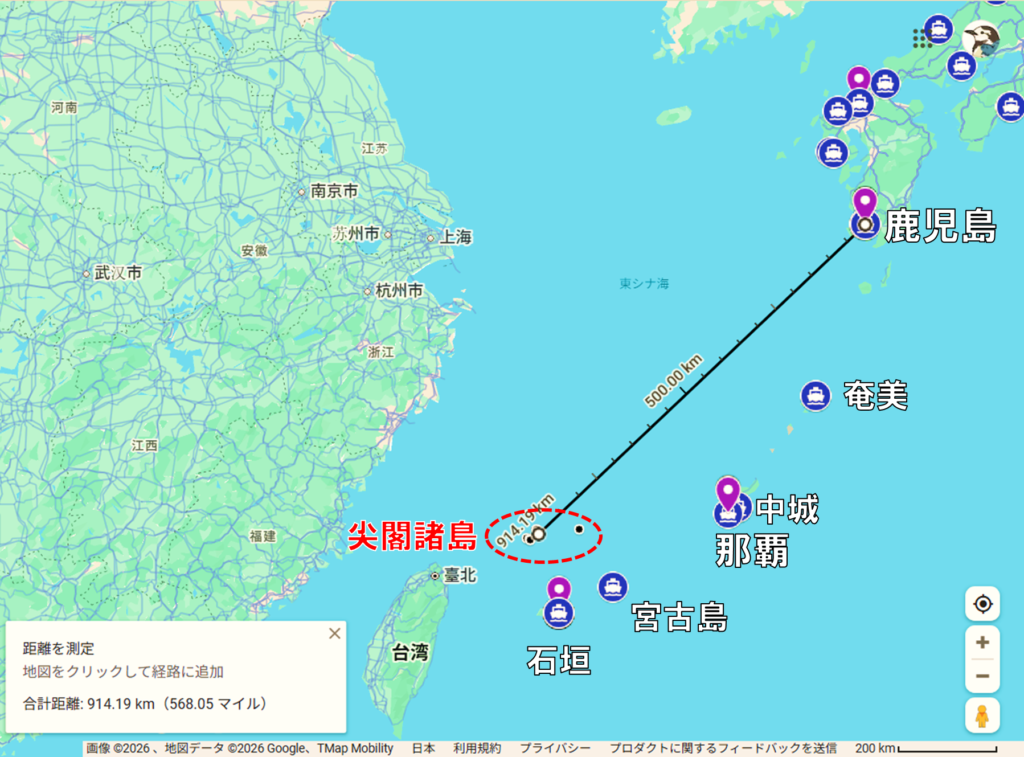 ただし、鹿児島から尖閣海域までは大まかに約900kmも離れています。