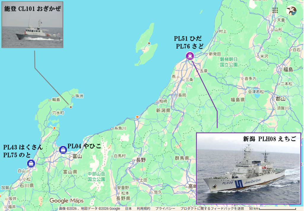 そのため新潟港を拠点として、約400km沖合の周辺海域に大型巡視船が派遣され警戒監視に当たっています。