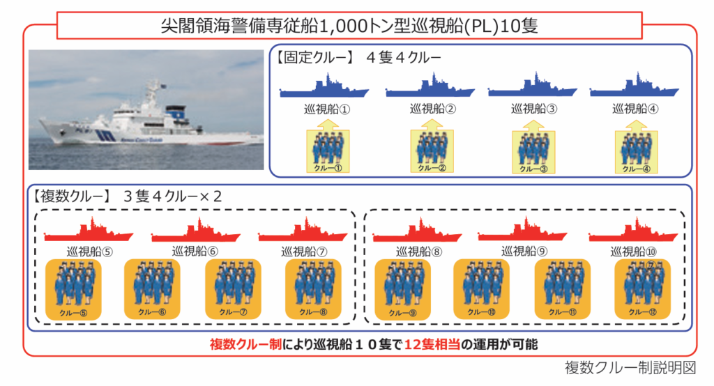 石垣におけるくにがみ型12隻のうち10隻が尖閣領海警備専従船として使用され、さらに6隻が【複数クルー制度】によって運用されています。